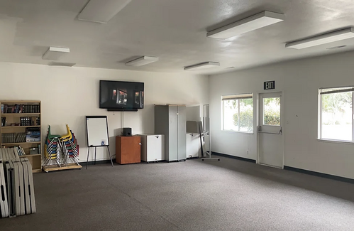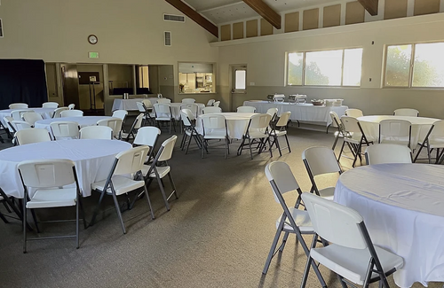 The Fellowship Center is a large multipurpose room that can accommodate up to 150 people in chairs, or about 100 at tables. It features men's and women's restrooms, a large kitchen with serving window, and a large bare wall for projection. Ideal for meetings, meals, or your crew's favorite game night.